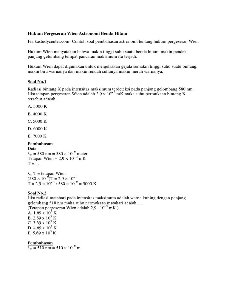 Contoh peristiwa radiasi benda hitam · gejala pemanasa gelobal dan efek rumah kaca · penggunaan termos · panelsurya · penggunaan pakaian. Untuk menjelaskan formula yang memenuhi semua data percobaan spektrum benda hitam. Cara mengerjakan soal radiasi benda hitam . Contoh soal dan pembahasan tentang radiasi benda hitam, materi fisika. Kirim soal matematika, fisika, kimia, ekonomi, biologi smp, sma, kuliahan. Pelajari rangkuman materi radiasi benda hitam dilengkapi dengan contoh soal radiasi benda hitam beserta pembahasan & jawaban lengkap dari soal un dan sbmptn . Radiasi kalor yang dipancarkan oleh suatu benda berantung pada suhunya. V = frekuensi radiasi elektromagnetik; 5grafik menyatakan hubungan intensitas gelombang (i) terhadap panjang gelombang, pada saat intensitas maksimum (m) dari radiasi suatu benda hitam . Rela berbagi ikhlas radiasi benda hitam sma kelas xii semester 2 standar . Download & view soal dan pembahasan radiasi benda hitam as pdf for free. Wien menjelaskan tentang bagaimana spektrum . Energi radiasi benda hitam dipancarkan secara diskontinu.